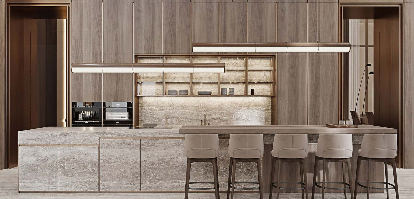 Exquisite Finishes: Masterfully selected interior design schemes with high-end European appliances and premium materials like travertine and engineered wood, ensuring a living space that is both unique and architecturally exquisite.